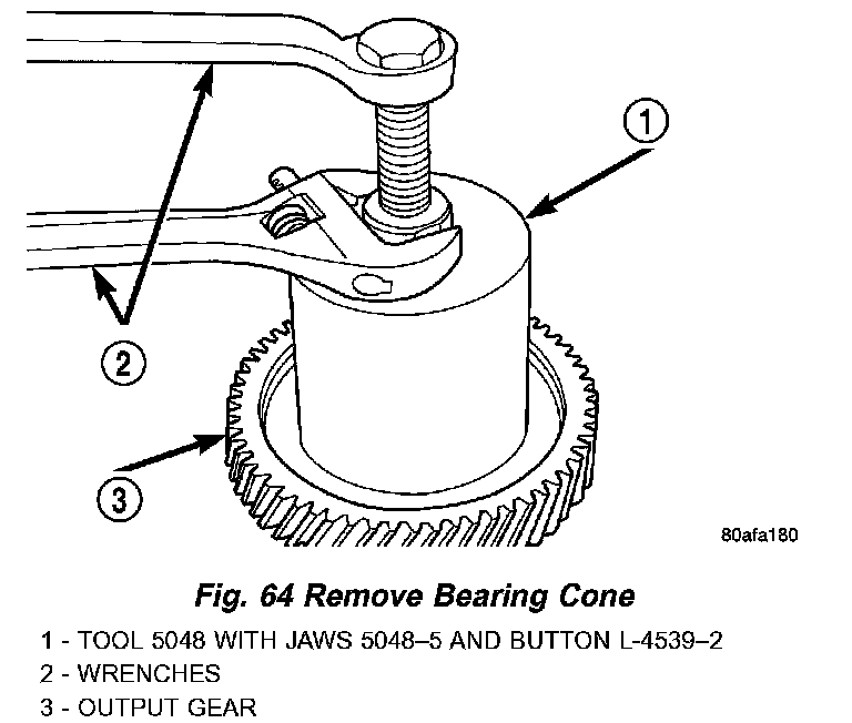 54. Using setup as shown in (Fig. 64), remove output gear bearing cone.