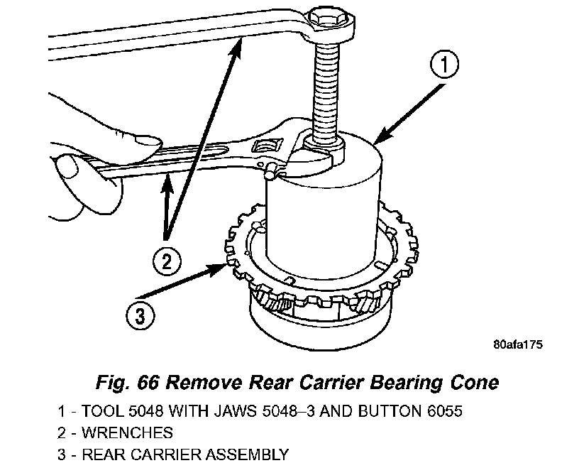 56. Remove rear carrier assembly bearing cone using setup shown in (Fig. 66).