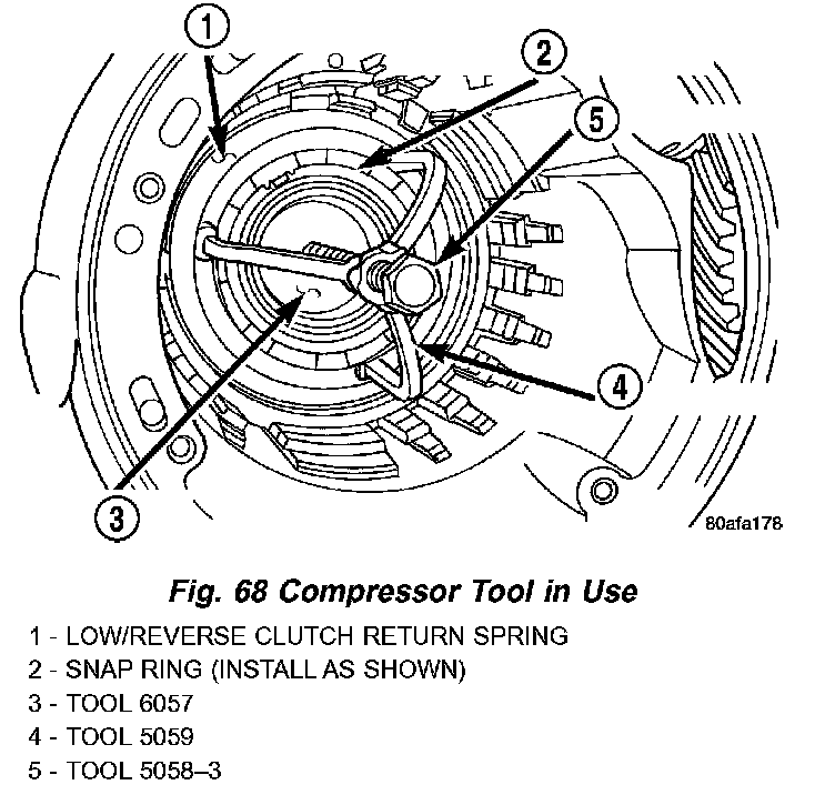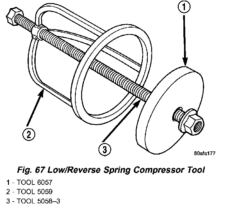 57. Install low/reverse spring compressor tool as shown in (Fig. 67) (Fig. 68).