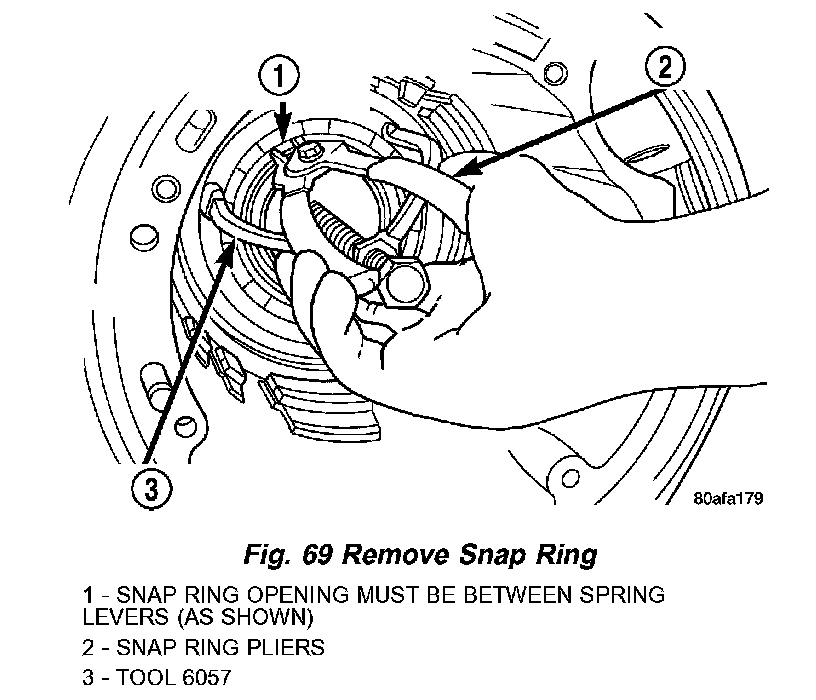 58. Compress low/reverse piston return spring and remove snap ring (Fig. 69).