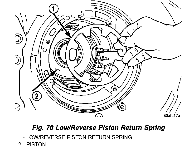 59. Remove low/reverse spring compressor tool and low reverse piston return spring (Fig. 70).