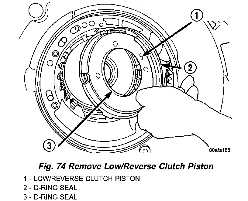 63. Remove low/reverse clutch piston (Fig. 74).