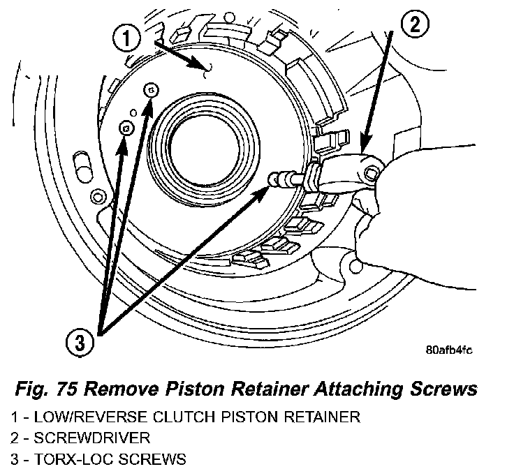64. Remove low/reverse piston retainer-to-case screws (Fig. 75).