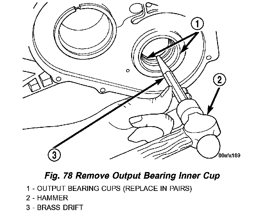 67. Using a hammer and suitable drift, drive out inner output bearing cup (Fig. 78).