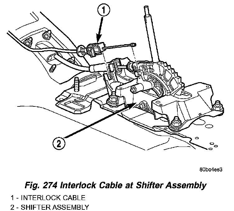 5. Disconnect the shifter/ignition interlock cable from the shifter lever and bracket as shown in (Fig. 274). Remove the cable core end from the plastic cam of the shifter mechanism and release cable from shifter bracket.