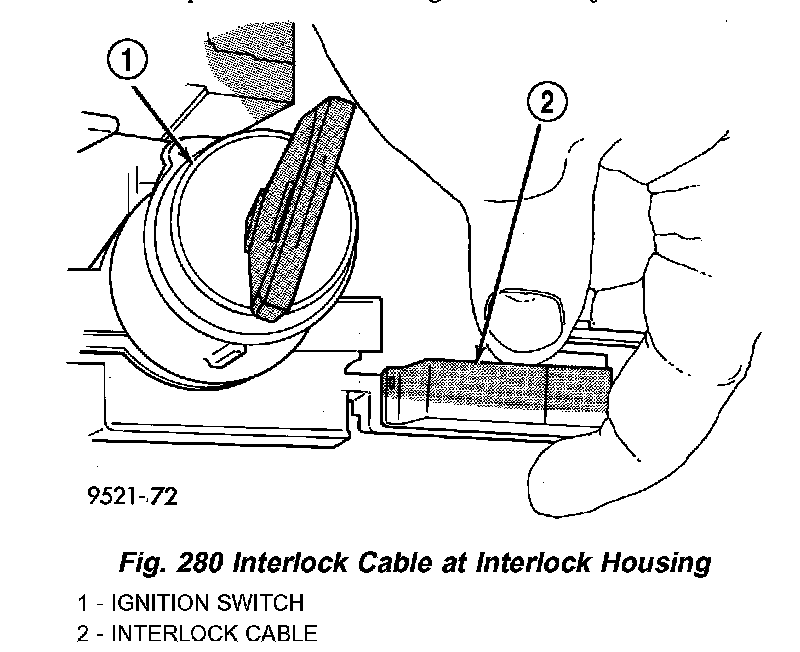 3. Install the interlock cable into the interlock housing at the steering column (Fig. 280). Verify the cable snaps into the housing and is fully seated.