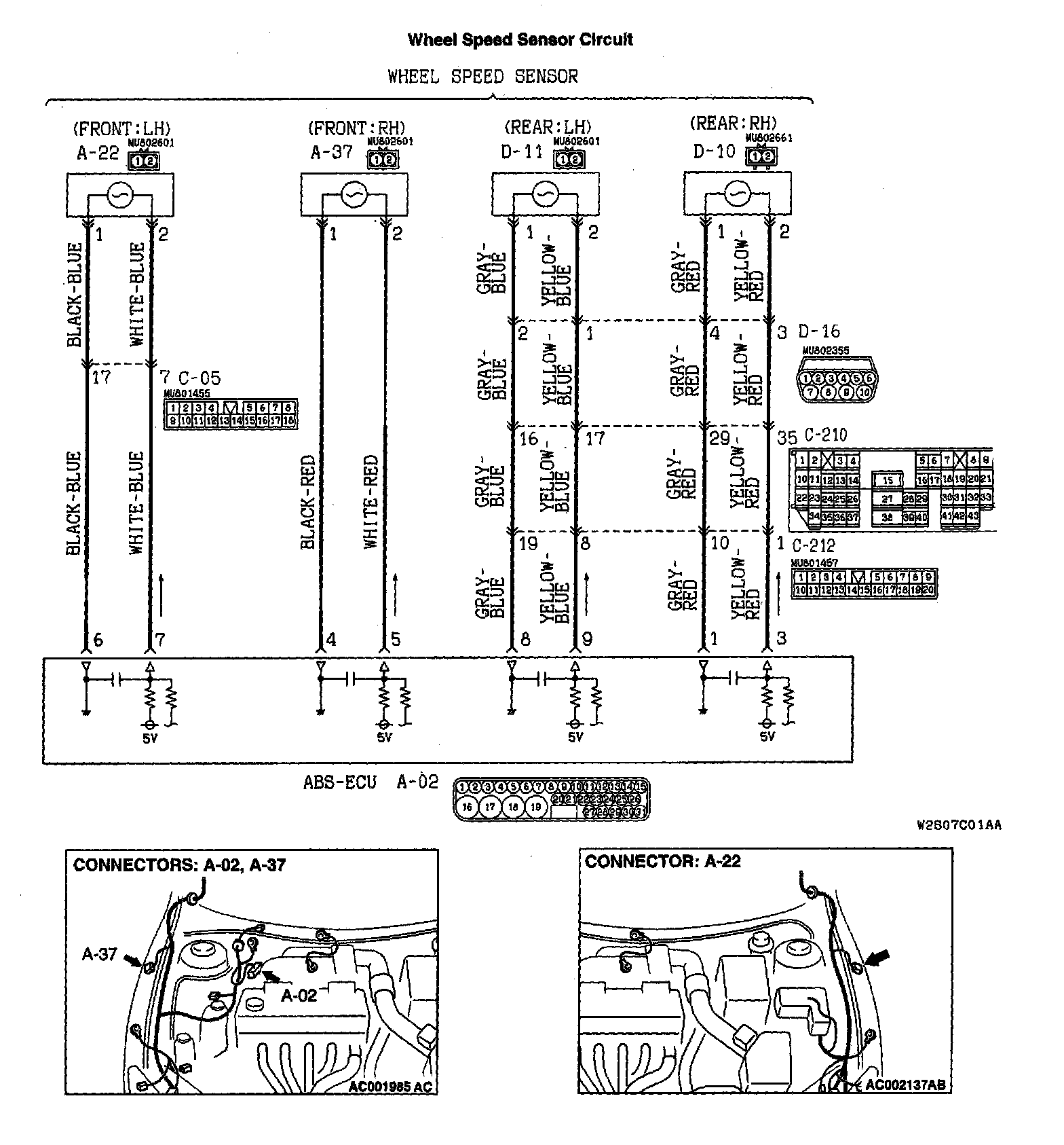 Q:Are any harness wires between ABS-ECU connector A 02 and wheel speed sensor