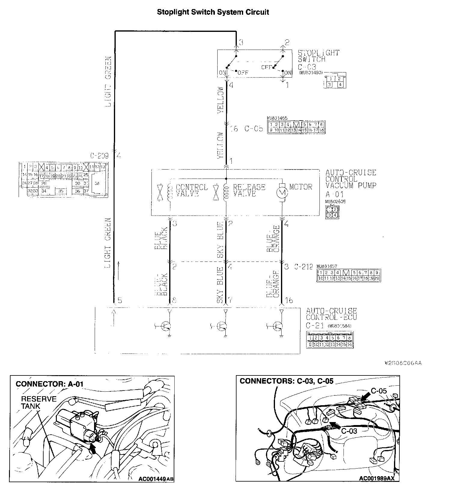 NO: Check the harness wire between stoplight switch connector C-03 and auto-cruise control vacuum pump connector A-01 for open circuit or damage. Then repair if necessary.