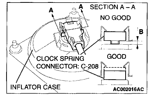 1. Remove the air bag module mountings and check clock spring connector C-208. At this time, check that there is no gap at place B shown in the illustration.