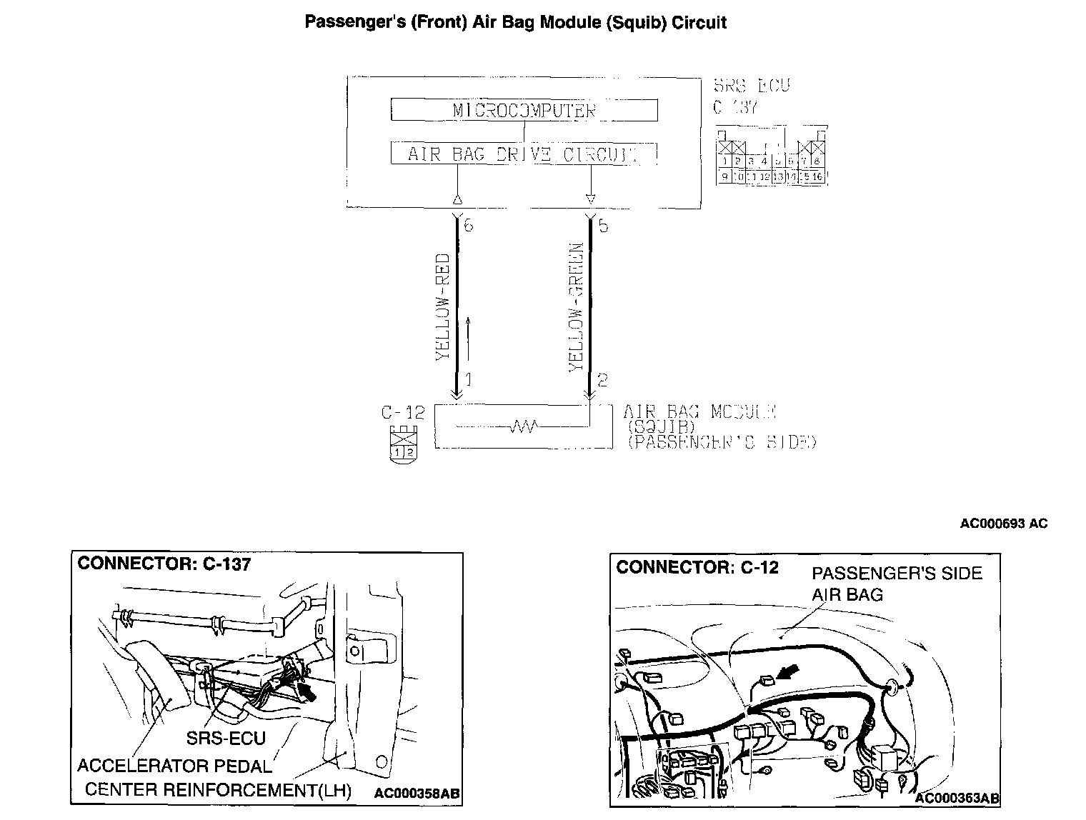 NOTE: *: The squib circuit connectors integrate a "short" bar (which prevents the air bag from deploying unintentionally due to static electricity by shorting the positive wire to the ground wire in the squib circuit when the connectors are disconnected). Therefore, if the connector is damaged or improperly engaged, the short bar may not be released when the connector is connected. Disconnect connectors C-12 and C-137 and reconnect them before proceeding the diagnosis below. After erasing the diagnostic trouble code in the ECU memory check if the diagnostic trouble code set again. If the diagnostic trouble code does not set it is suspected that the diagnostic trouble code above set due to The improper engaged connector.
