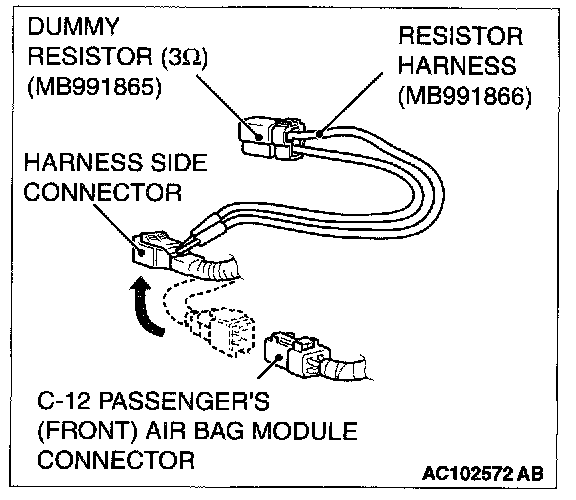 2. Disconnect the passenger's (front) air bag module connector C-12 and insert the resistor harness (MB991866) behind the harness side connector.