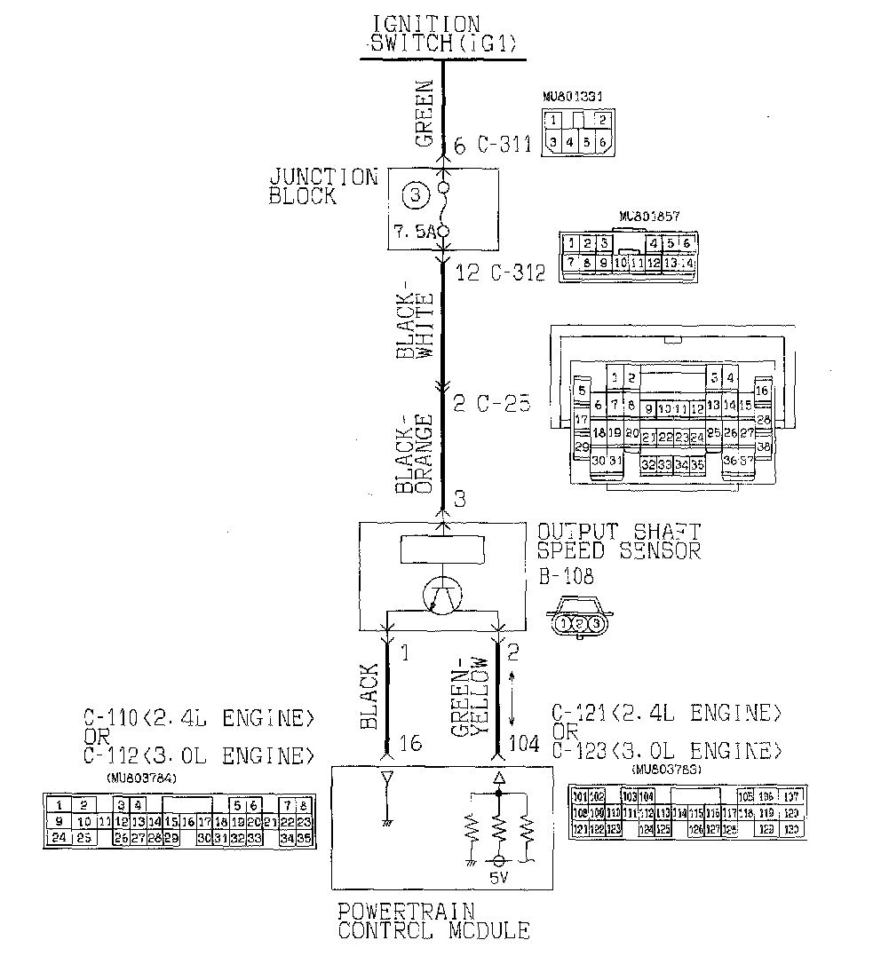 STEP 7. Check harness for short circuit to ground between PCM connector C-121 <2.4L Engine> or C-123 <3.0L Engine> terminal 104 and output shaft speed sensor connector B-108 terminal 2.