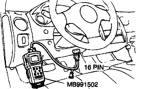 CAUTION: To prevent damage to scan tool MB991502, always turn the ignition switch to the "LOCK" (OFF) position before connecting or disconnecting scan tool MB9911602.