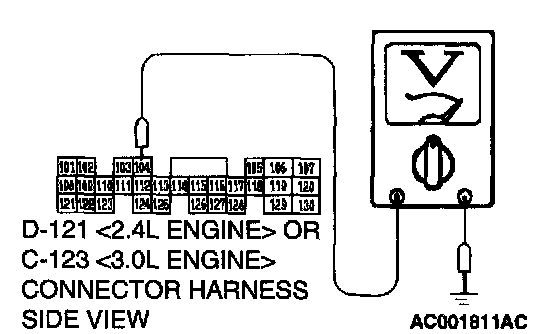 STEP 5. Check the sensor output voltage at PCM connector C-121 <2.4L Engine> or C-123 <3.0L Engine> by backprobing.