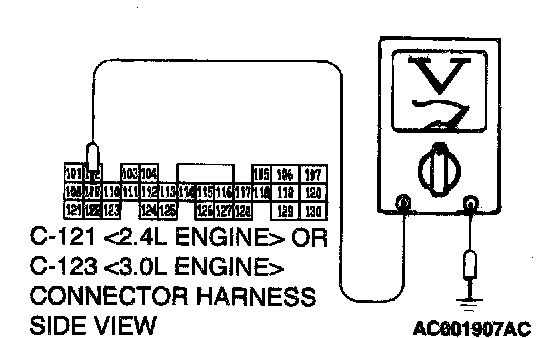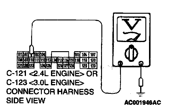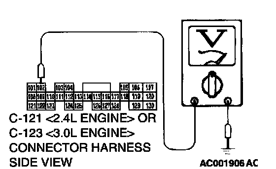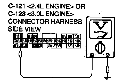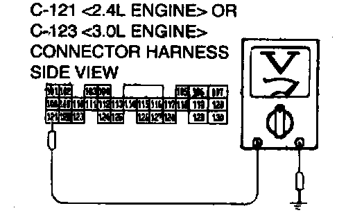 STEP 28. Check the switch output voltage at PCM connector C-121 <2.4L Engine> or C-123 <3.0L Engine> by backprobing.