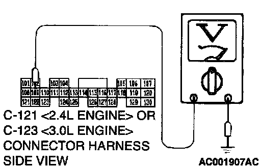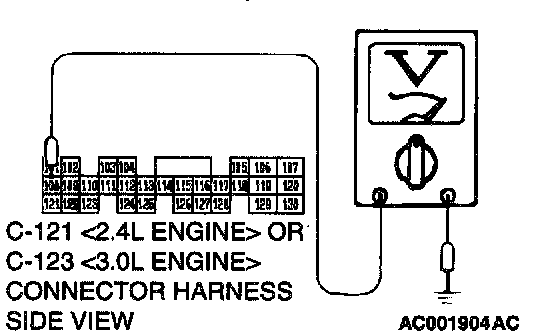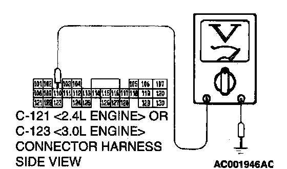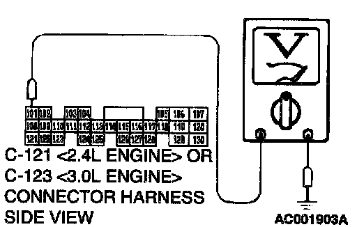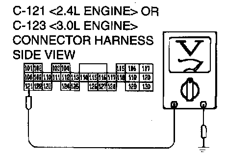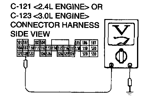 STEP 19. Check the switch output voltage at PCM connector C-121 <2.4L Engine> or C-123 <3.0L Engine> by backprobing. ("2" position)