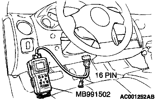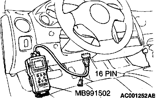 CAUTION: To prevent damage to scan tool MB991502, always turn the ignition switch to the "LOCK H (OFF) position before connecting or disconnecting scan tool M0991502.