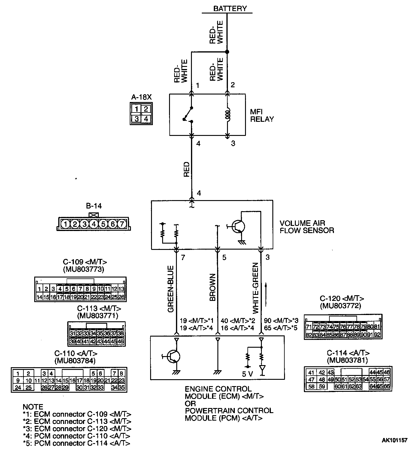 - The volume air flow sensor power is supplied from the MFI relay (terminal 4), and the ground is provided on the ECM (terminal 40)