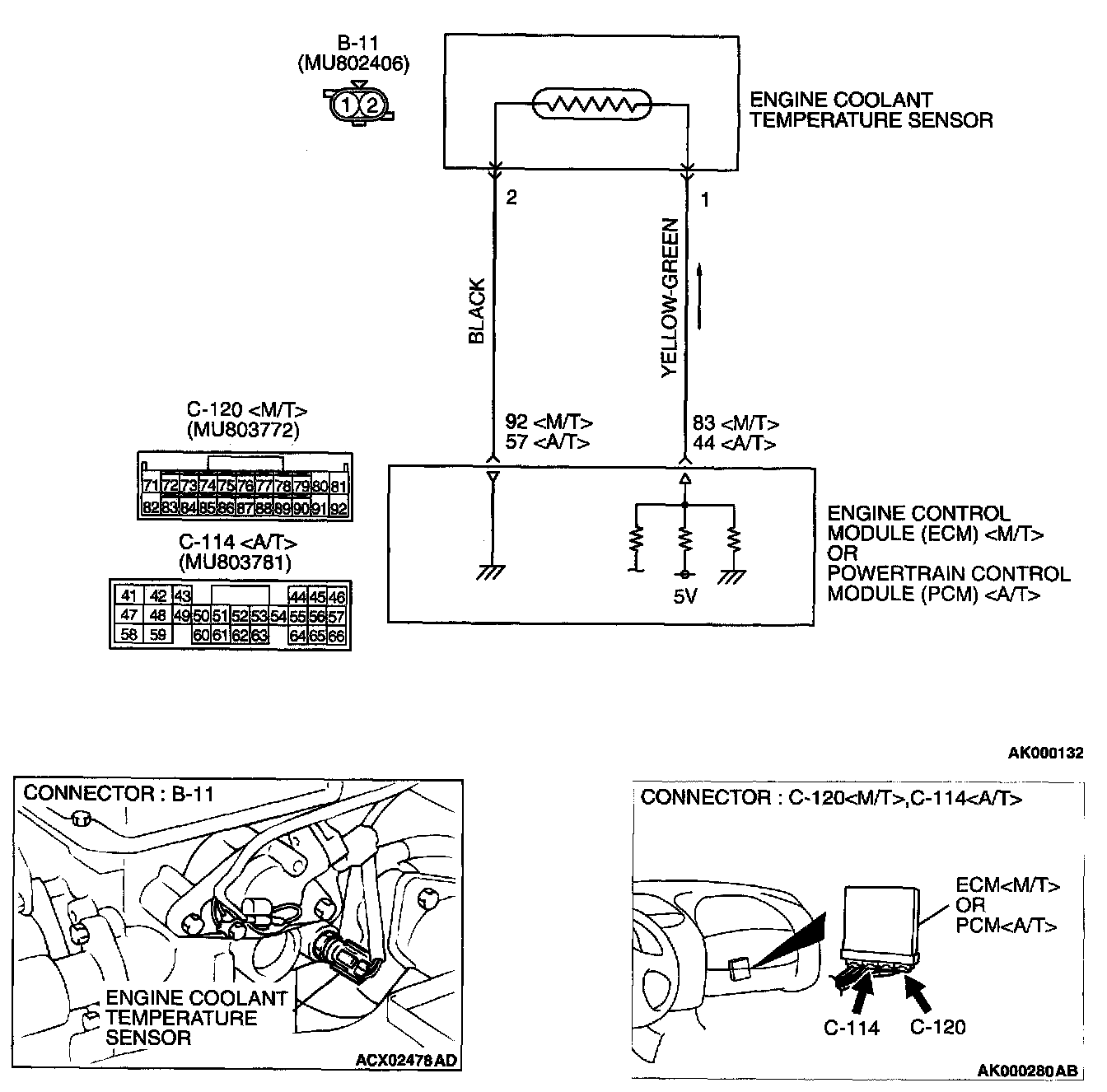 - 5-volt voltage is applied to the engine coolant temperature sensor output terminal (terminal 1) from the ECM (terminal 83)