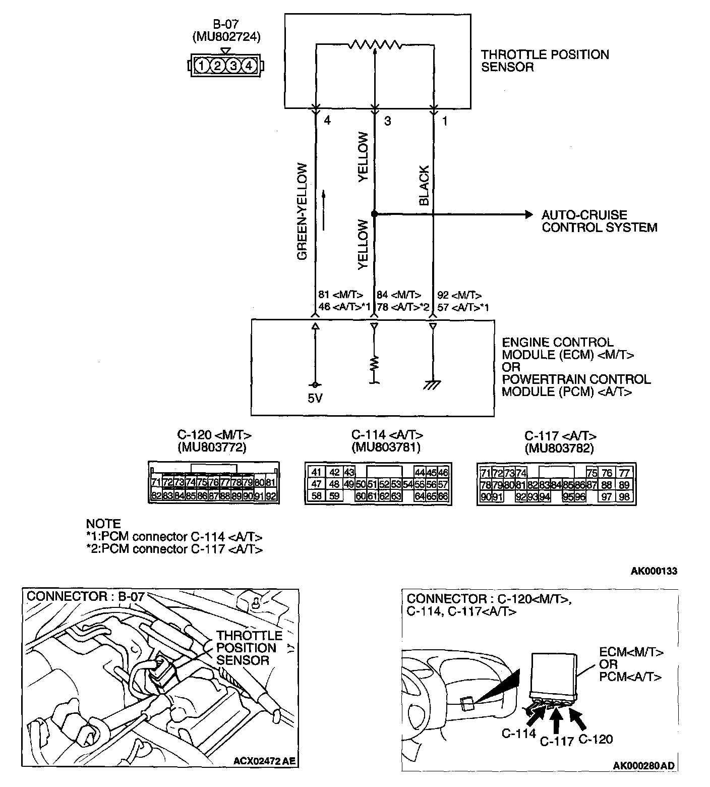 STEP 5. Check for open circuit and harness damage between throttle position sensor connector B-07 terminal 2 and ECM connector C-120 terminal 92