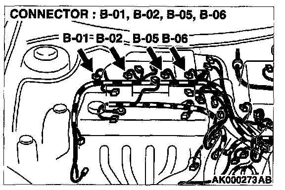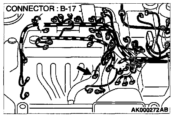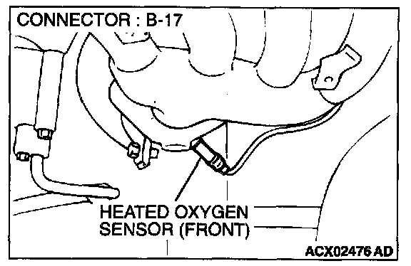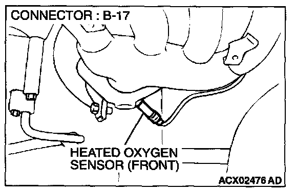 1. Disconnect the heated oxygen sensor (front) connector B- 17 and connect test harness special tool, MD998464 to the connector on the heated oxygen sensor (front) side.