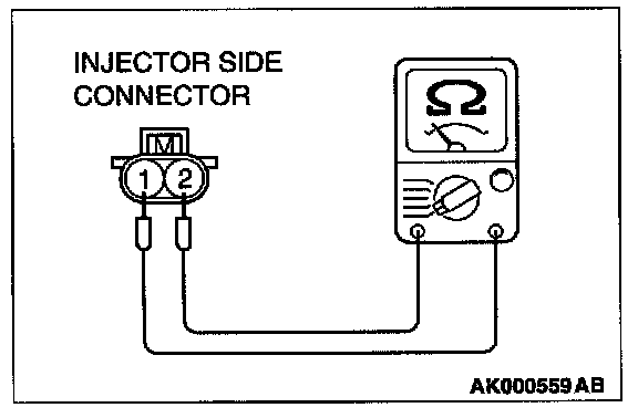 2. Measure the resistance between injector side connector terminal 1 and 2.