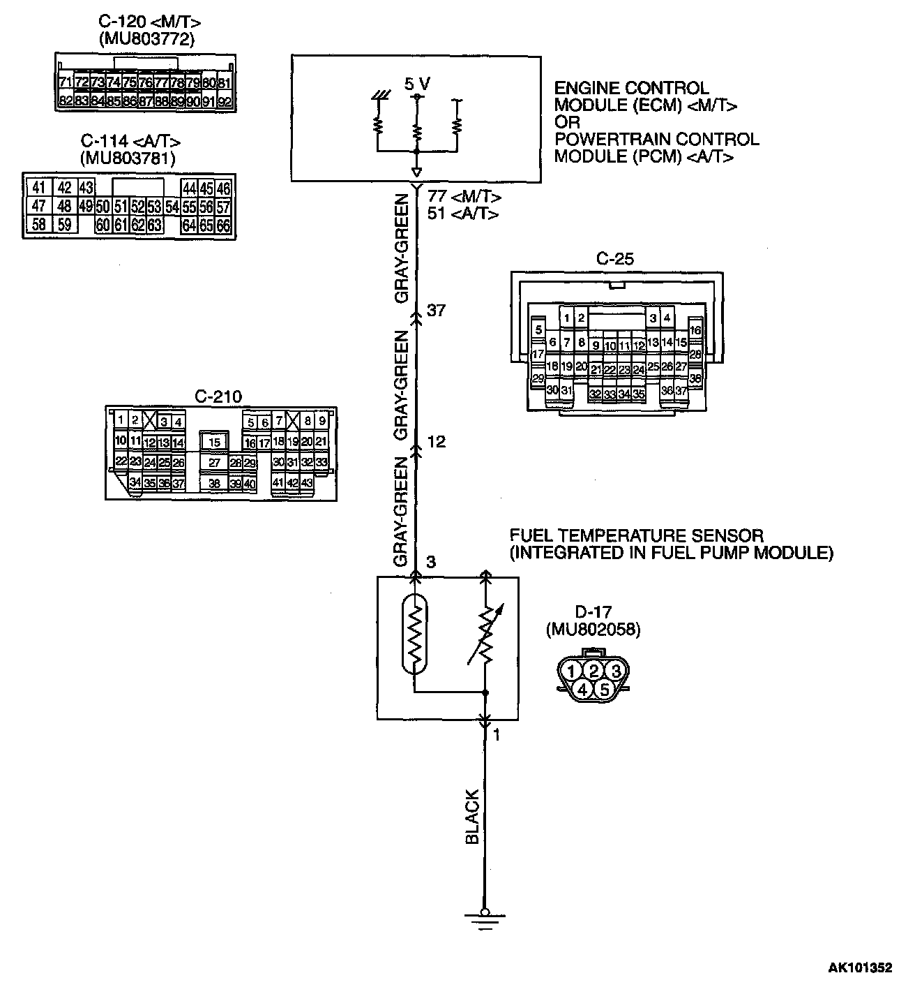 - 5-volt voltage is applied to the fuel temperature sensor output terminal (terminal 3) from the ECM (terminal 77)