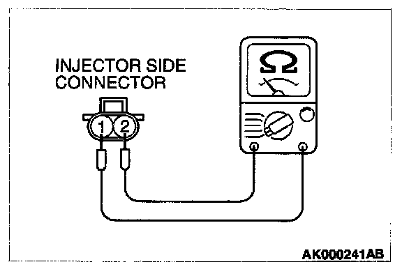 2. Measure the resistance between each injector side connector terminal 1 and 2.