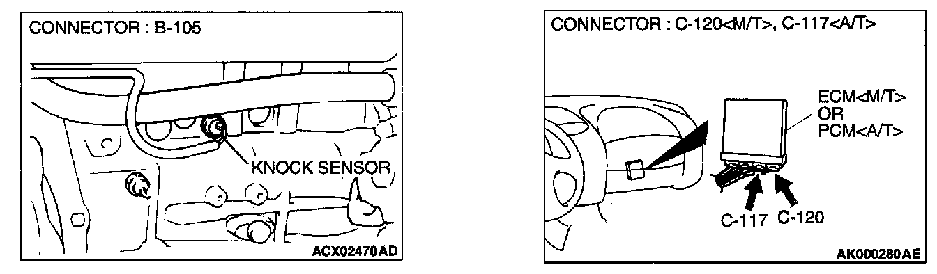 STEP 4. Check for open circuit, short circuit to ground and harness damage between knock sensor connector B-105 terminal 1 and ECM connector C-120 terminal 78