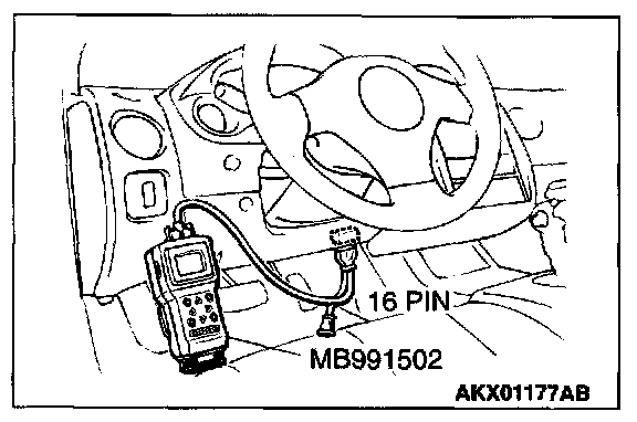 CAUTION: To prevent damage to scan tool MB991502, always turn the ignition switch to the "LOCK" (OFF) position before connecting or disconnecting scan tool MB991502.