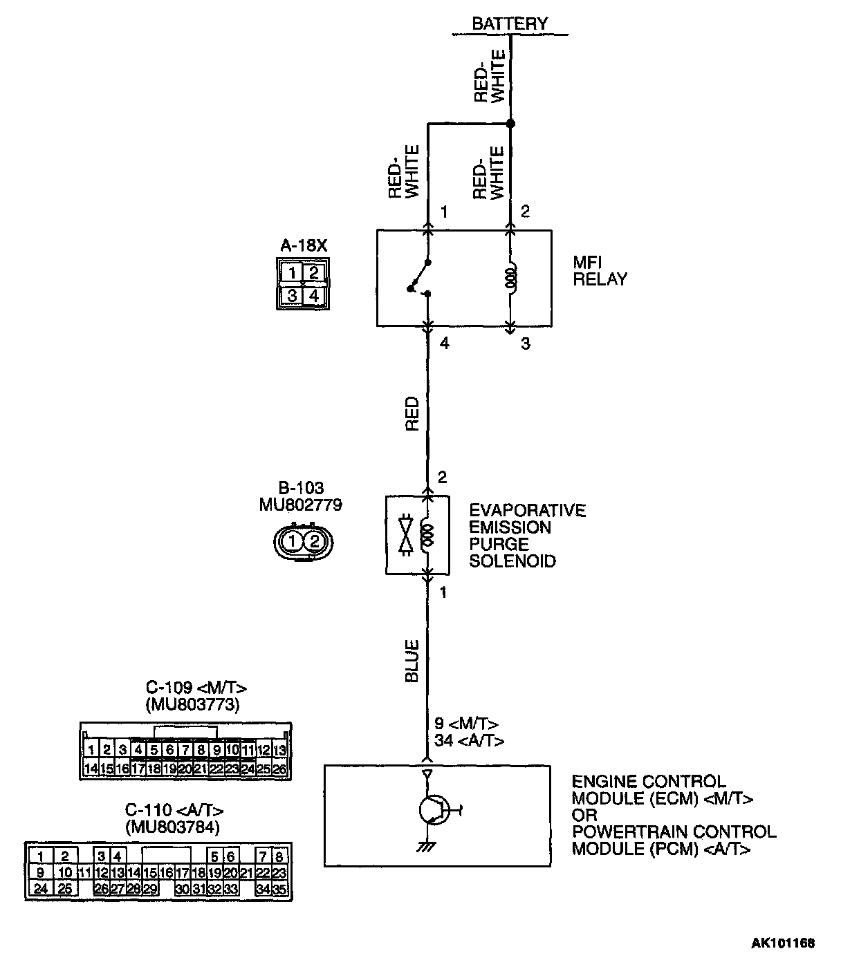 STEP 10. Check for harness damage between MFI relay connector A-18X terminal 4 and evaporative emission purge solenoid connector B-103 terminal 2.