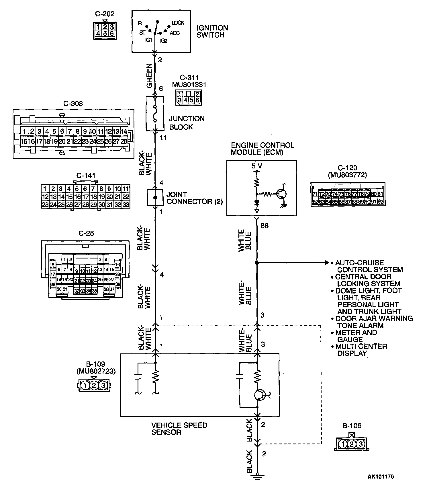 - A 5-volt voltage is applied to the vehicle speed sensor output terminal (terminal 3) from the ECM (terminal 86). The vehicle speed sensor generates a pulse signal when the output terminal is opened and grounded.