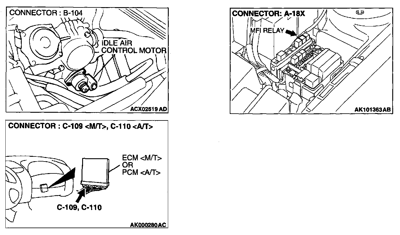 STEP 12. Check for harness damage between MFI relay connector A-18X terminal 4 and idle air control motor connector B-104 terminal 2, 5.