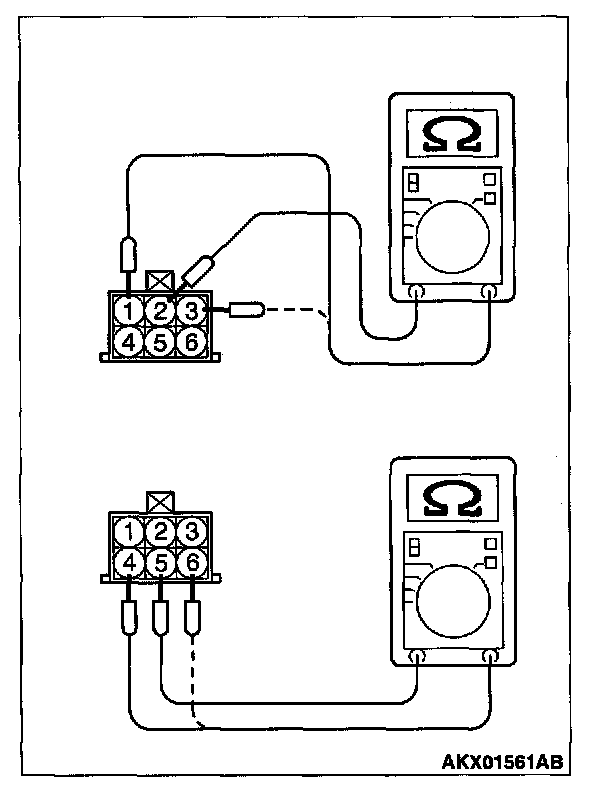 2. Measure the resistance between idle air control motor connector terminal 2 and either terminal 1 or terminal 3.