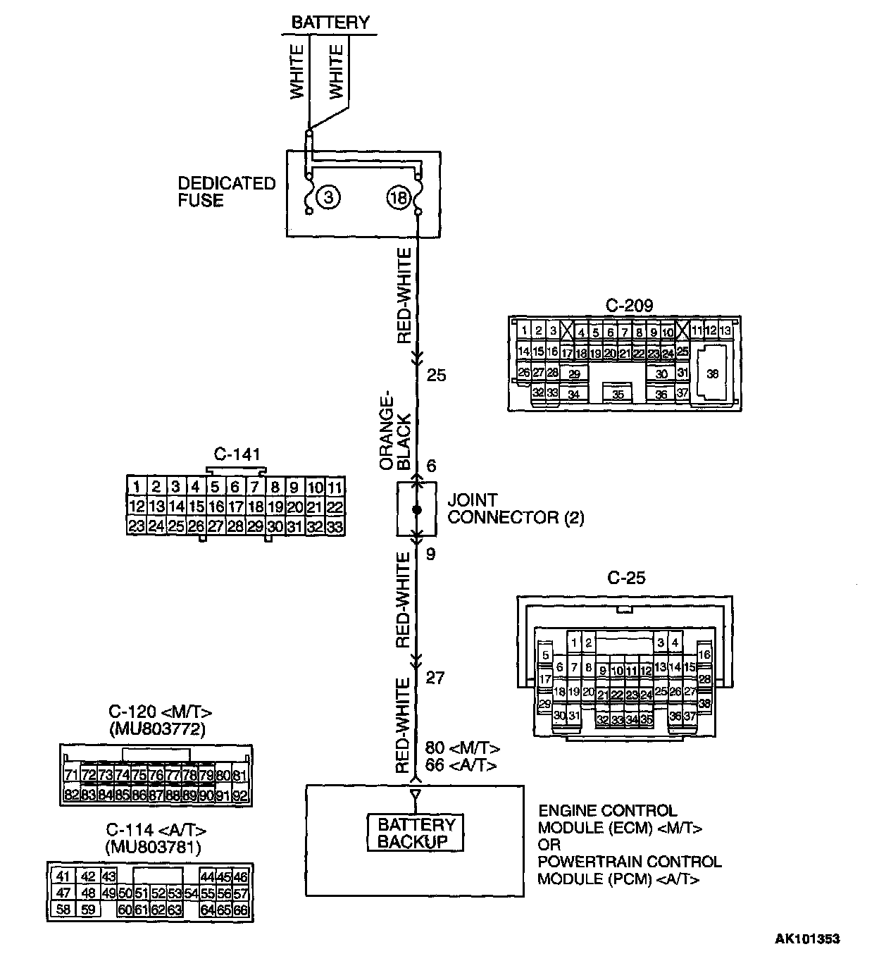 YES: Check connectors C-25, C-141 and C-209 at intermediate connector for damage, and repair or replace as required. Refer to Harness Connector Inspection. It intermediate connector are in good condition, repair harness wire between battery and ECM connector C-120