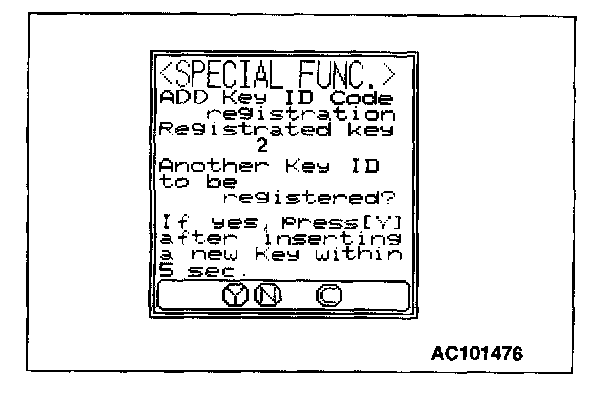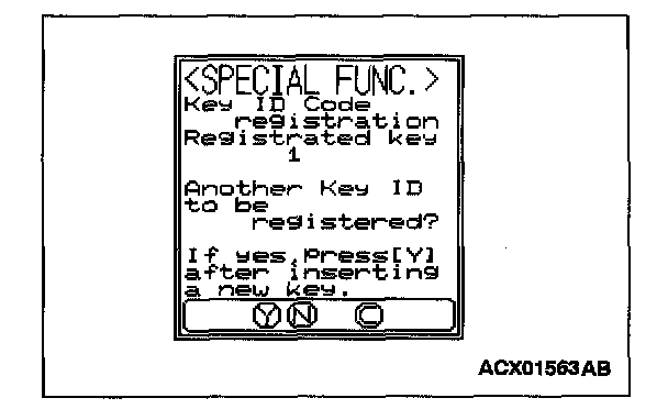 10. The number of keys currently registered will be displayed. To register an additional key, replace the ignition key with the next key to be registered within five seconds and then press the "YES" key. Key ID registration screen will be displayed, then register another key.