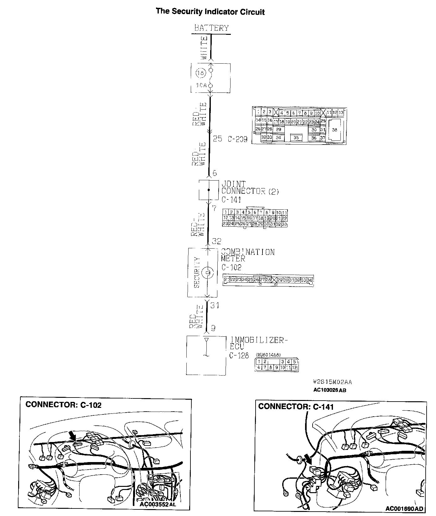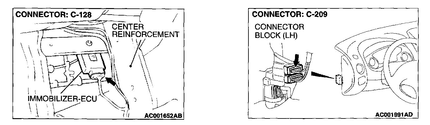Q: Are immobilizer-ECU connector C-128 and combination meter connector C-102 damaged?