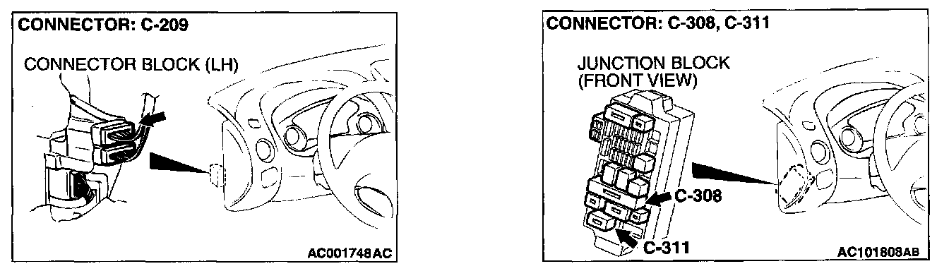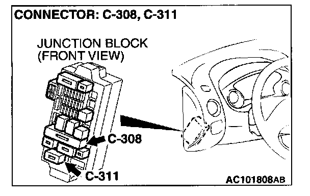 NOTE: After checking joint connector C-141 and junction block connector C-311 and C-308, check the wires. If joint connector C-141 and junction block connector C-311 and C-308 are damaged, repair or replace them. Refer to Harness Connector Inspection.