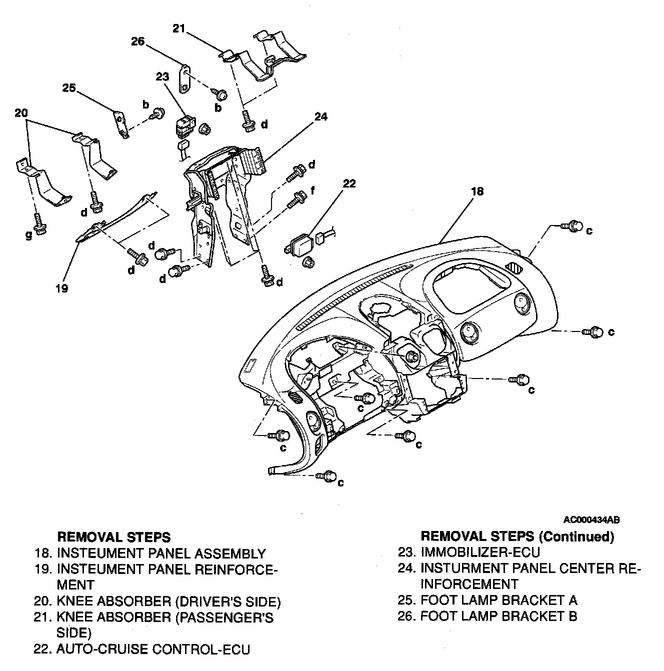 The bolts and screws described below are used for installation of the instrument panel. They are indicated by symbols.