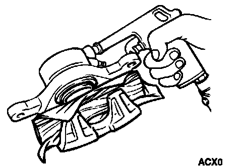 Place a piece of wood, etc. against the caliper body as shown. Blow compressed air through the brake hose to remove the piston boot and piston.