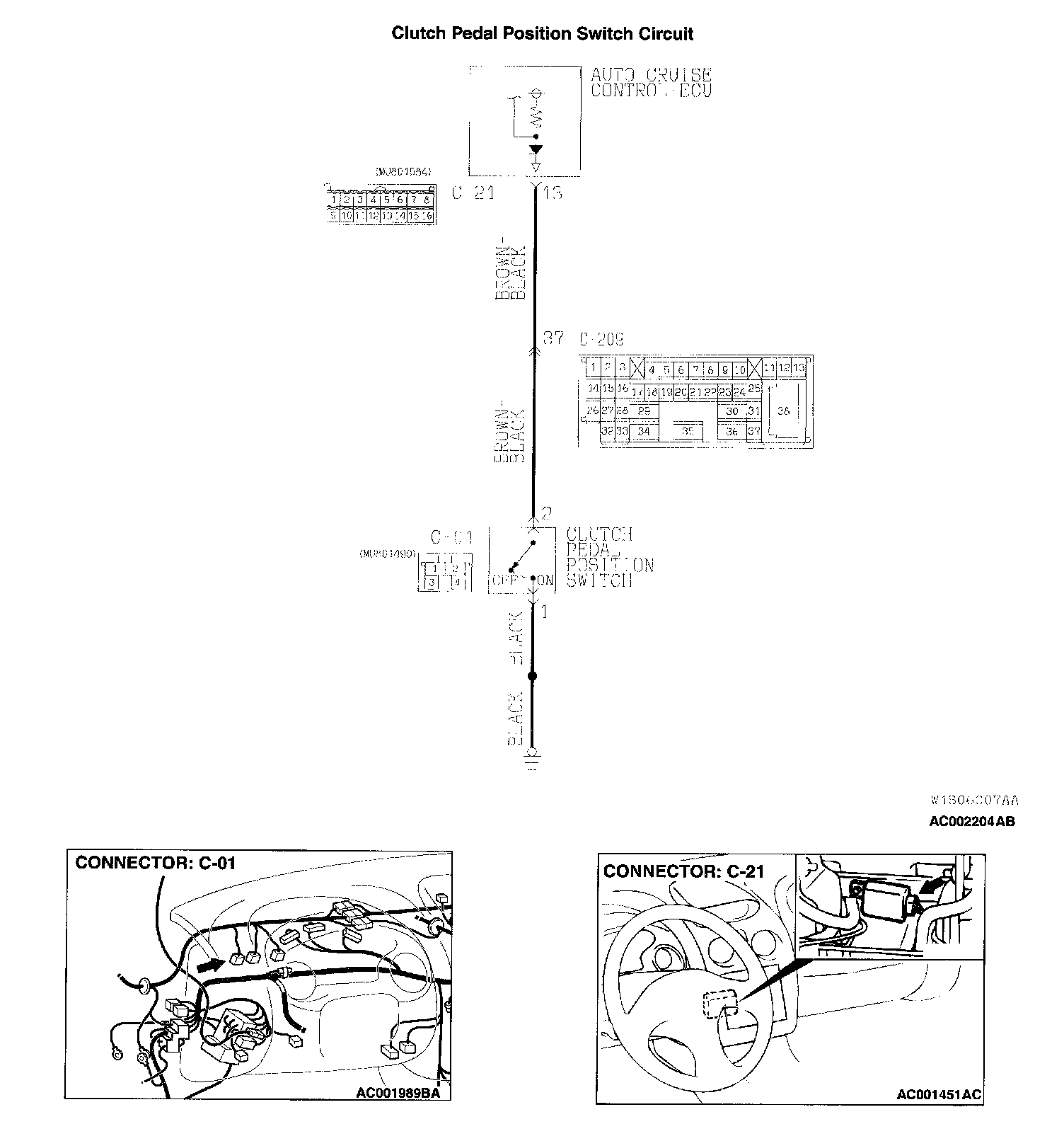 This circuit indicates the operation status of the clutch pedal position switch. When the clutch pedal position switch is ON (clutch pedal is depressed), the voltage of auto-cruise control-ECU terminal number 13 will indicate 0 volt.