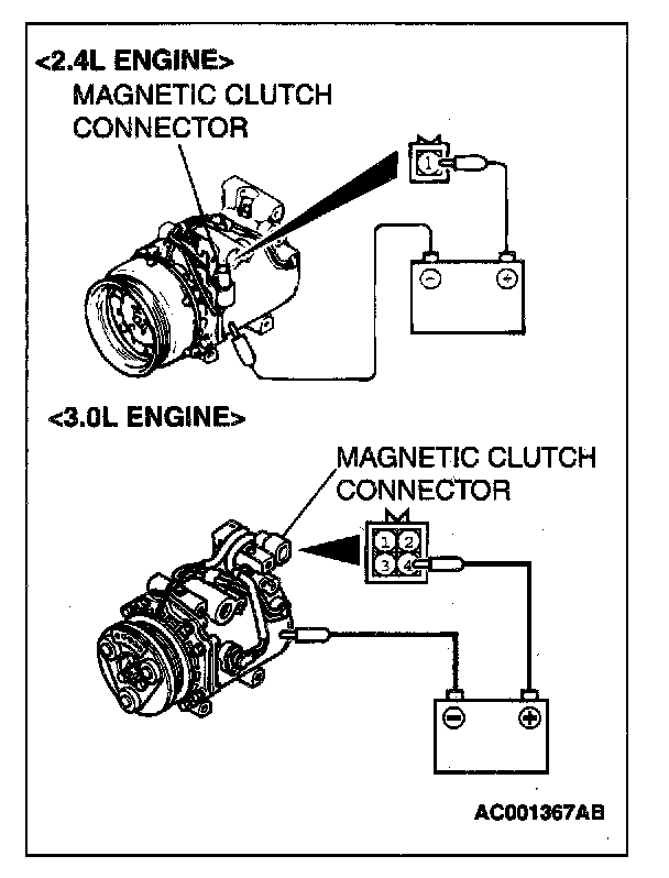 Connect the battery (+) terminal to the compressor magnetic clutch connector terminal 1; <2.4L engine>/terminal 4; <3.0L engine>, and ground the battery (-) terminal to the body of the compressor.