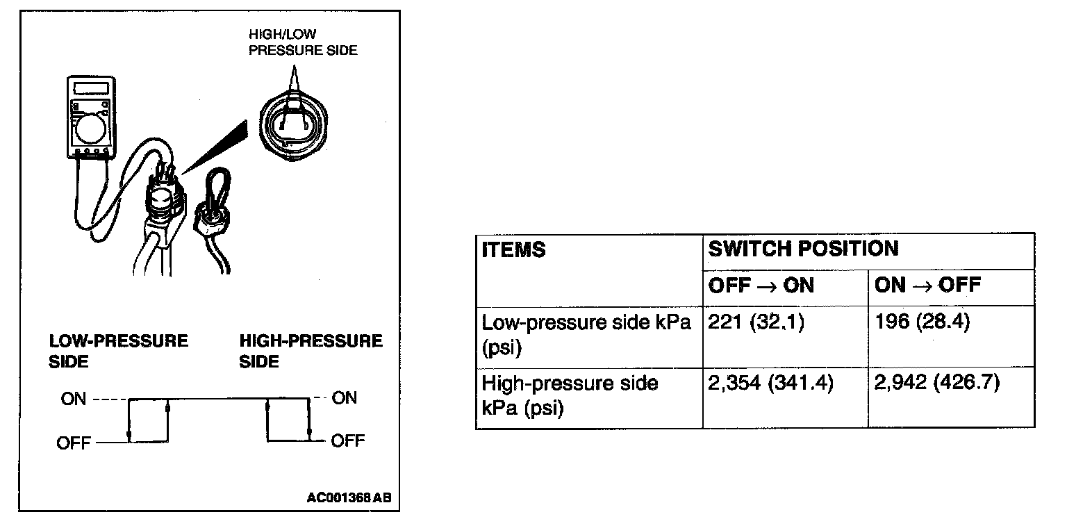 3. When the high/low pressure sides of the dual pressure switch are at operation pressure (ON) and the resistance is Less than 2 ohm between the respective terminals, then the condition is normal. If open loop, replace the switch.