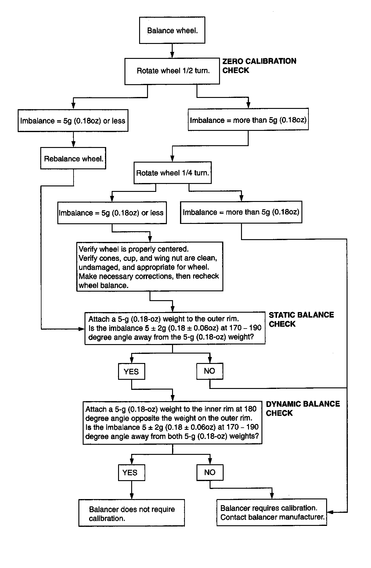 Check your balancer's calibration approximately every 100 balances. Your wheel balancer's instruction manual should include calibration procedures. If the calibration procedures specifically for your balancer are missing, use the generic steps for zero calibration, static balance, and dynamic balance checks. The wheel balancer calibration checks are also described in the flowchart.