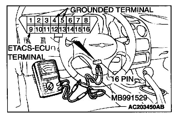 1. Use special tool MB991529 to connect a voltmeter between ground terminal 4 or 5 and ETACS-ECU terminal 9 of the data link connector.