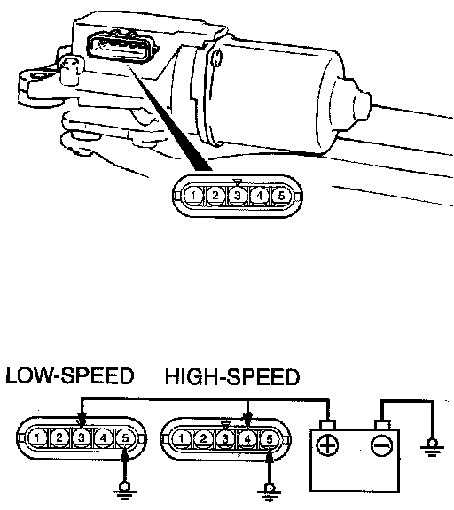 2. Connect a battery to the windshield wiper motor as shown. Then check the windshield wiper motor operates normally at high and low speeds.