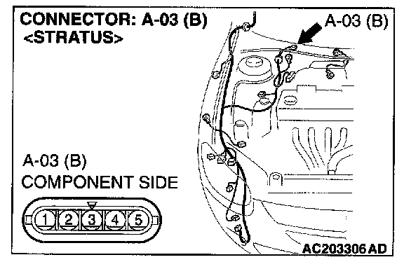 STEP 6. Check windshield wiper motor connector A-03 for loose, corroded or damaged terminals, or terminals pushed back in the connector.