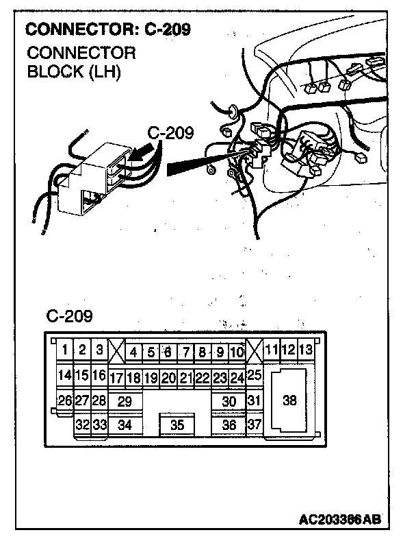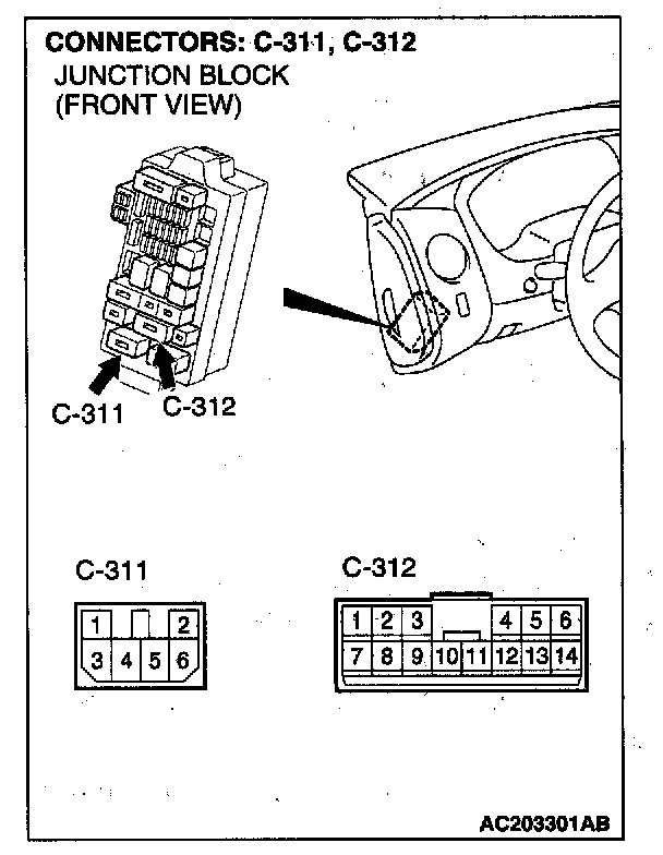 NOTE: Also check intermediate connector C-209, junction block connectors C-311 and C-312 for loose, corroded, or damaged terminals, or terminals pushed back in the connector. If intermediate connector C-209, junction block connector C-311 or C-312 is damaged, repair or replace the damaged components) as described in Harness Connector Inspection.