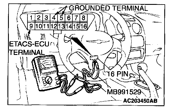 1. Use special tool MB991529 to connect a voltmeter between ground terminal 4 or 5 and ETACS-ECU terminal 9 of the data link connector.