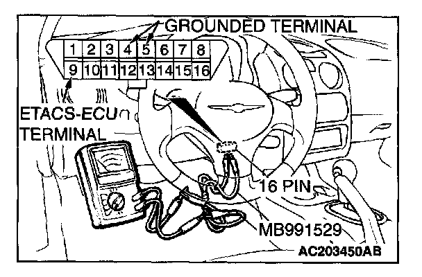 1. Use special tool MB991529 to connect a voltmeter between ground terminal 4 or 5 and ETACS-ECU terminal 9 of the data link connector.